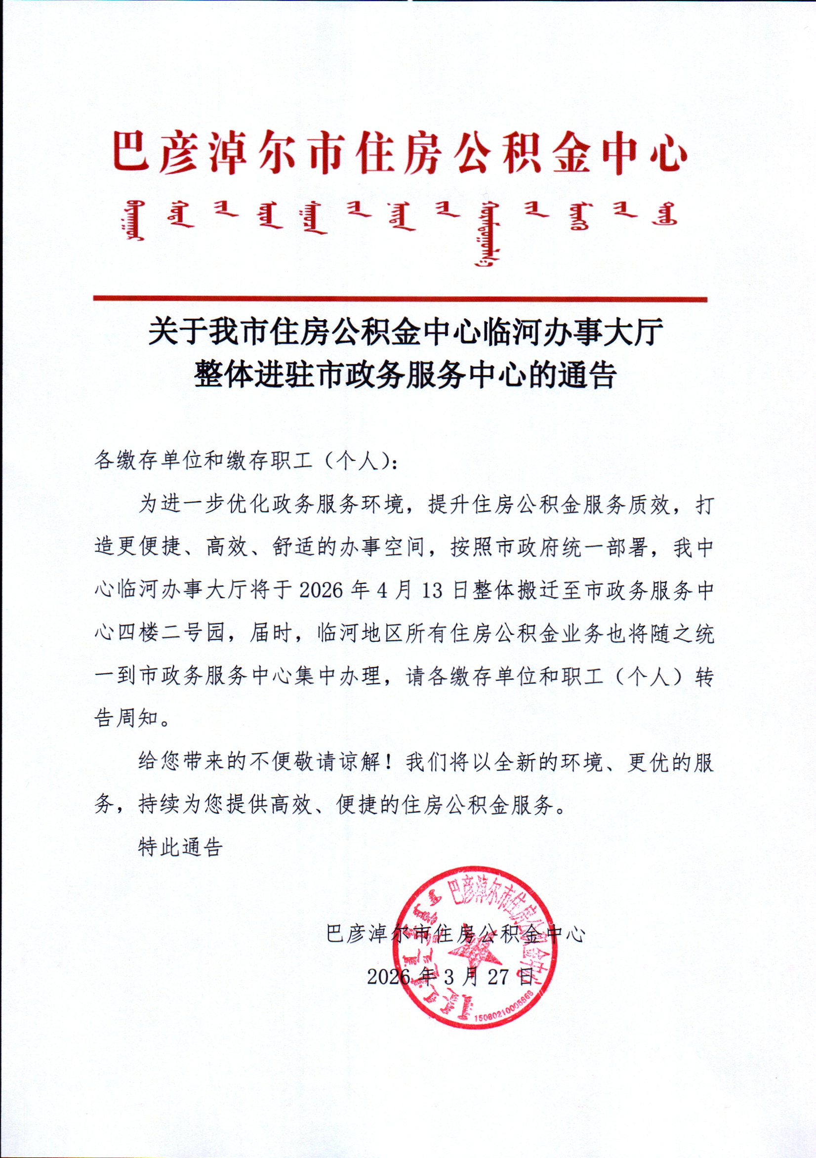 关于我市住房公积金中心临河办事大厅整体进驻市政务服务中心的通告