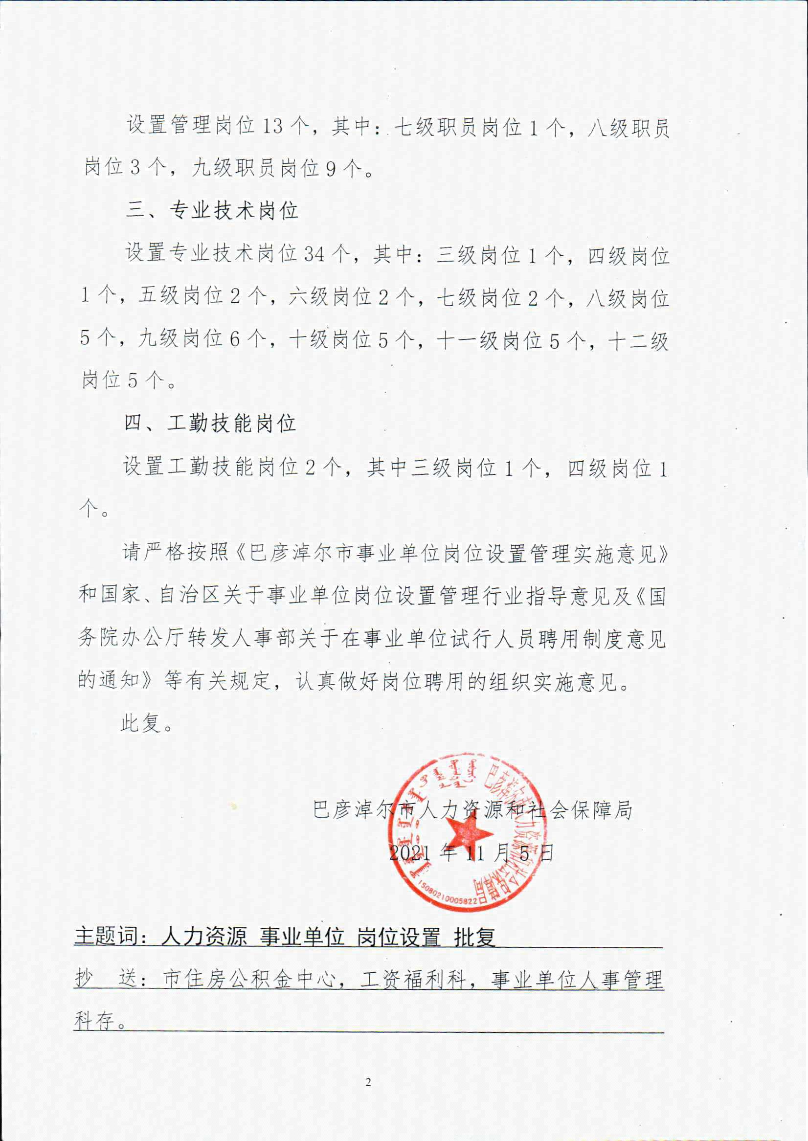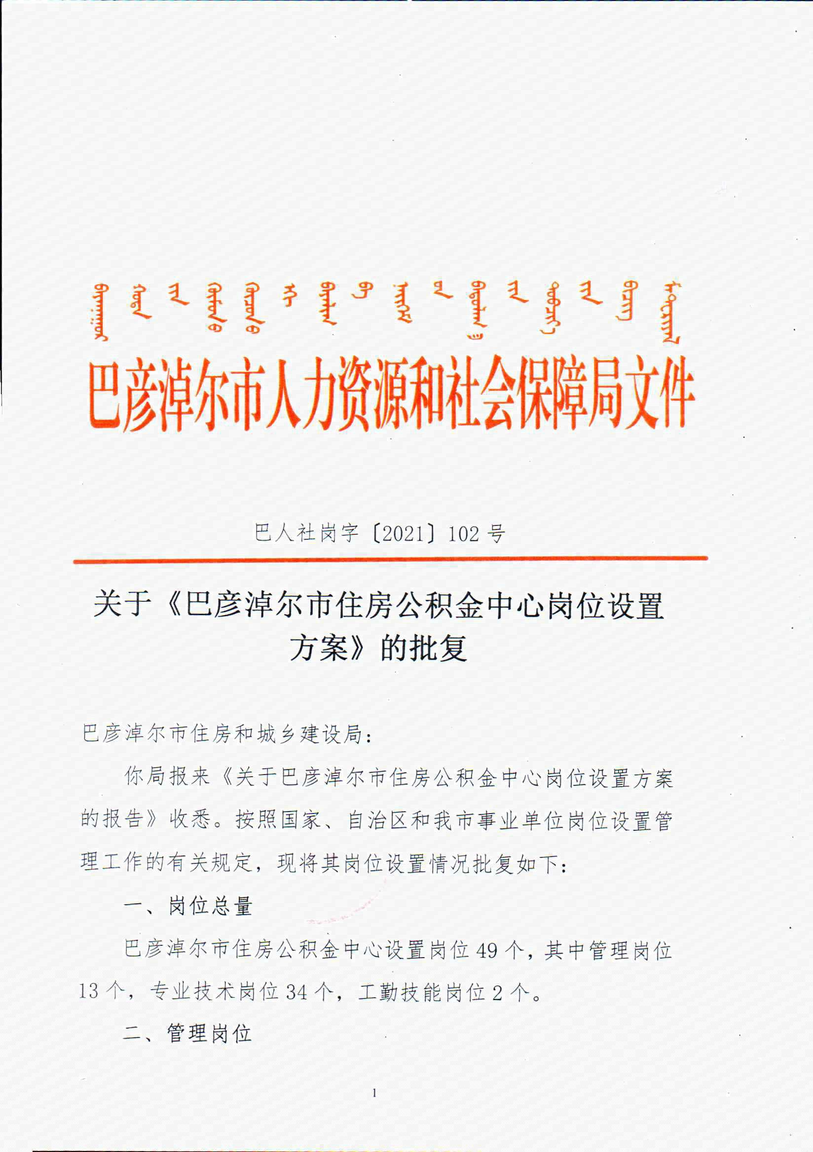 关于《巴彦淖尔市住房公积金中心岗位设置方案》的批复